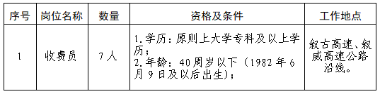 根據(jù)敘古敘威公司一線運(yùn)營(yíng)管理工作需要,擬面向蜀道集團(tuán)系統(tǒng)開展收費(fèi)崗位內(nèi)部選聘工作。現(xiàn)將相關(guān)事宜公告如下:
