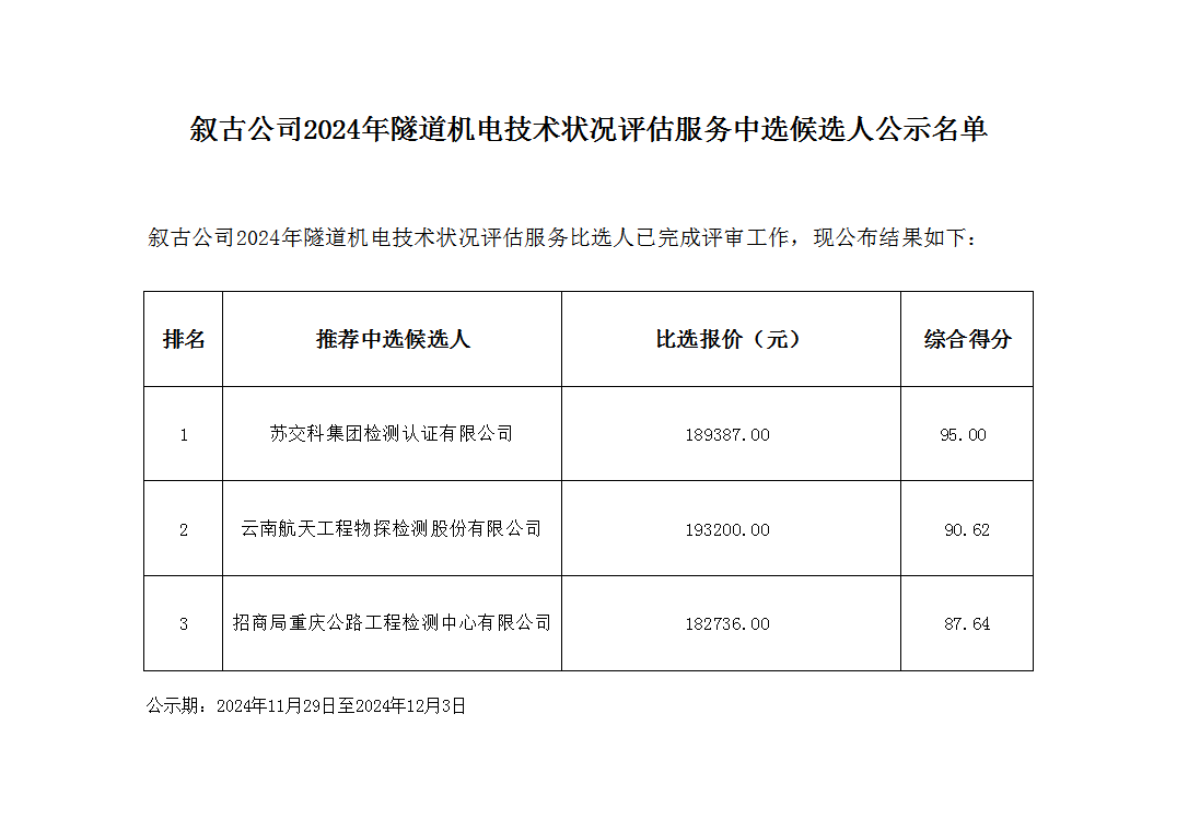敘古公司2024年隧道機電技術狀況評估服務中選候選人公示名單
