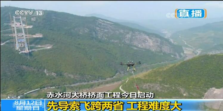 上午10時10分,在赤水河大橋貴州岸243.5米高的主塔塔頂上,無人機牽引著直徑2mm、長2千米的先導索起飛,飛跨1200米的赤水河大峽谷,約3分鐘后到達四川岸228.5米的主塔塔頂,在貴州和四川兩省交界處的赤水河大橋上再次上演了“飛渡赤水”的雄奇畫面,將赤水河大橋兩岸主墩索塔連為一體。