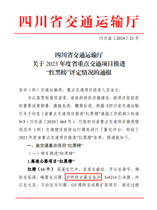 為認(rèn)真貫徹落實(shí)省委、省政府拼經(jīng)濟(jì)搞建設(shè)、抓項(xiàng)目促投資的重要決策部署,激勵(lì)先進(jìn)、鞭策后進(jìn),近日,四川省交通運(yùn)輸廳針對省重點(diǎn)交通項(xiàng)目推進(jìn)情況進(jìn)行了量化評(píng)分,形成了2023年度省重點(diǎn)交通項(xiàng)目推進(jìn)“紅黑榜”名單,古金高速榮登2023年度省重點(diǎn)交通項(xiàng)目推進(jìn)“紅榜”。
